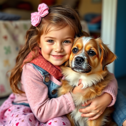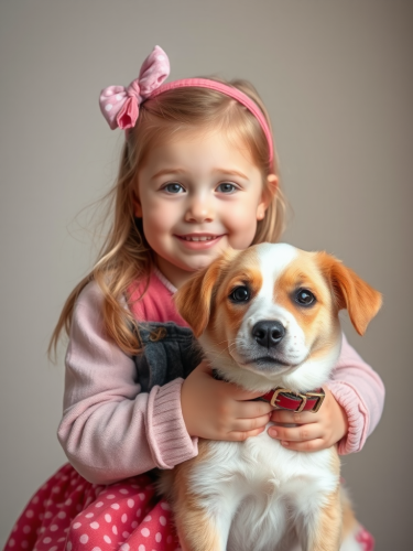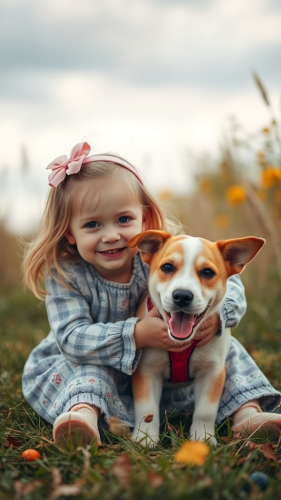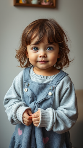 Take a photo of a 5-year-old white child, with darker blue-green eyes and dark blonde and curly hair. This child is a girl and is smiling for the photo. His hair is long. His teeth are a little small and are a little spaced apart.