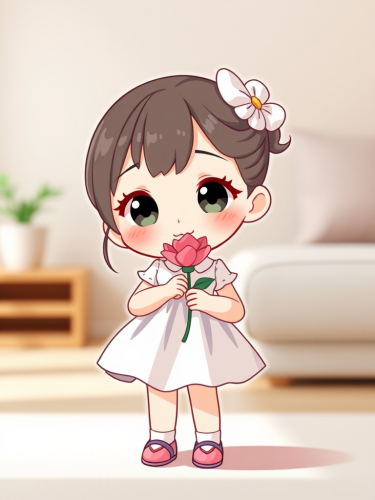 A girl with blue and pink hair, red cheeks, white dress, holding flowers in her hand, in the style of manga, colorful ink drawings with light gray and dark cyan tones, half body portrait with a white background, in . --ar 105:128 --v 6.1