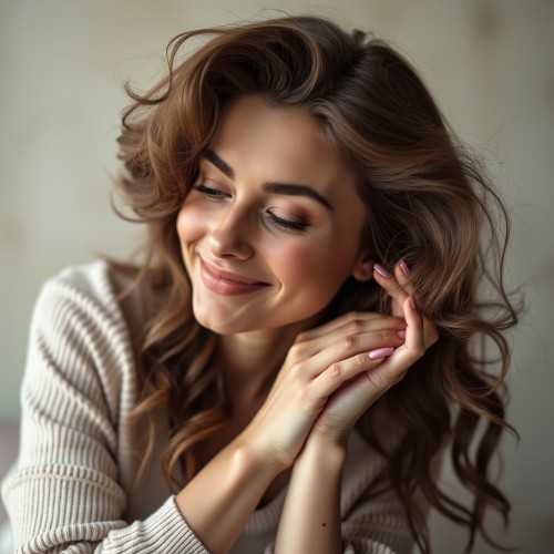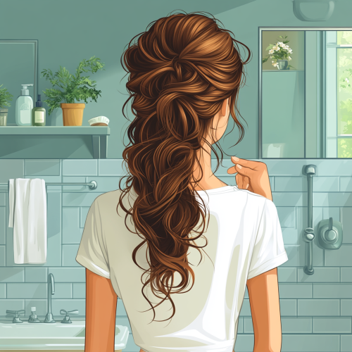 Caucasian girl with brown curly hair, hand stroking hair over shoulder, bathroom background, flat illustration style, beautiful illustration with realistic details, high resolution --s 750