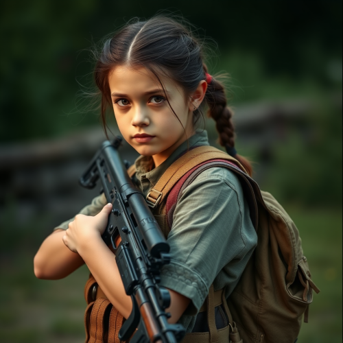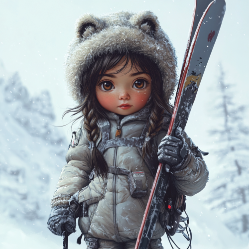 a realistic image of a little girl in a one-piece ski suit with a furry hoodie, she has long dark brown hair braided on one side, she is wearing ski boots and carrying her skis over her shoulder in a winter scene.