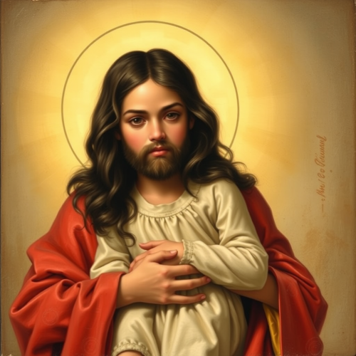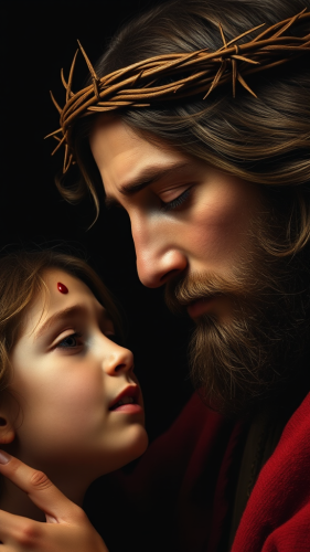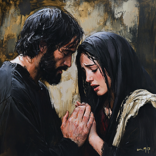 Attractive weeping woman, black hair tattered clothes comes to Jesus begging him to hear her and he ignores her. Hyperrealistic. There is distance between Jesus and the woman.