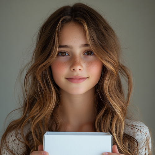 A realistic, high-resolution studio photograph of a teenage girl (12-16 years old) with wavy brown hair and brown eyes, smiling gently. She holds a white box with both hands, centered in the frame. The background is a clean, plain studio backdrop with soft, even lighting that highlights her friendly expression and natural features. Photographic quality, realistic skin texture, soft shadows, minimal post-processing. --s 750