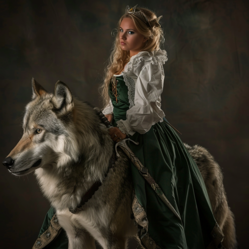 Beautiful, blond, 16 year old girl, that is full figured, wearing green and white medieval dress, Riding on a large wolf, holding a dagger while looking back over her shoulder frightened