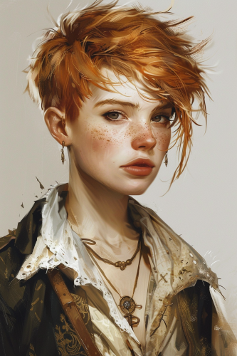 kit is a character in fantasy novel set in elizabethan tudor england. she is a 16 year old teenage girl who is a thief and a spy. she dressess as an elizabethan boy, in a dublet, and cuts her strawberry blond hair in to a messy long pixie cut. she has a cunning confident look in her eye. she has a scrap of a spell parchment to protect her from evil magic pinned to her jacket --ar 2:3 --v 6.0