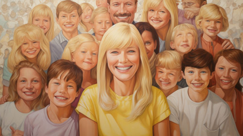 Hyper-detailed white background cartoon of a blond girl around her family. She looks happy to be arround her mother and father , oil painting, --ar 16:9