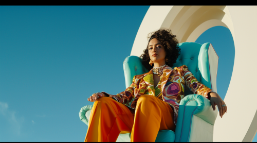 a businesswoman in colourful clothes sitting in a chair like a queen and looking at the camera. a spot light is on the woman. full figure of the woman is visible. some empty area in front of the woman. all white minimal environment. blue sky. cinematic. dynamic structure at a distance. photorealistic. wes anderson movie style --ar 16:9 --s 50 --v 6.0