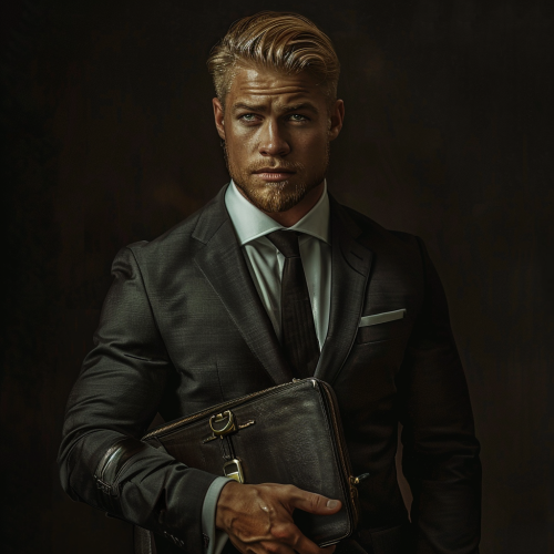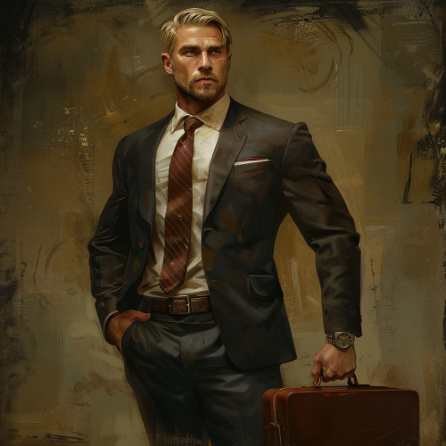 gorgeous alpha male all American, similar to Charlie Hunnam, smolder, blond hair, sophisticated polished suit, intense gaze, lean muscle masculine full body picture holding a briefcase, photo realistic, hd, ultra fine detail, canon 780, ultra high resolution, high quality --v 6.0
