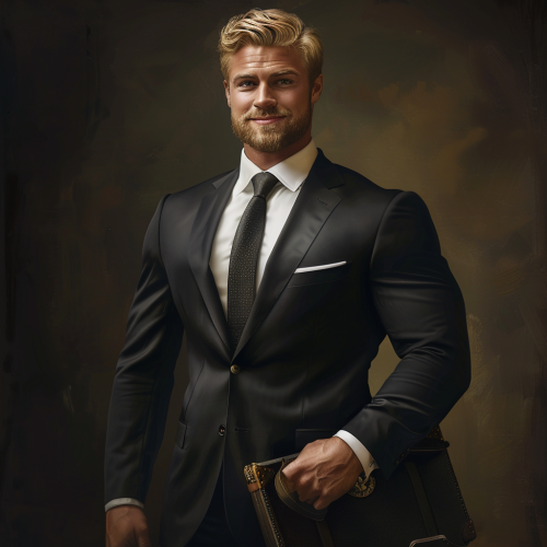 gorgeous alpha male all American, similar to Charlie Hunnam and Chris Hemsworth, smolder, blond hair, sophisticated polished suit, flirtatious smile, lean muscle masculine full body picture holding a briefcase, photo realistic, hd, ultra fine detail, canon 780, ultra high resolution, high quality --v 6.0