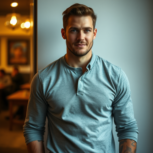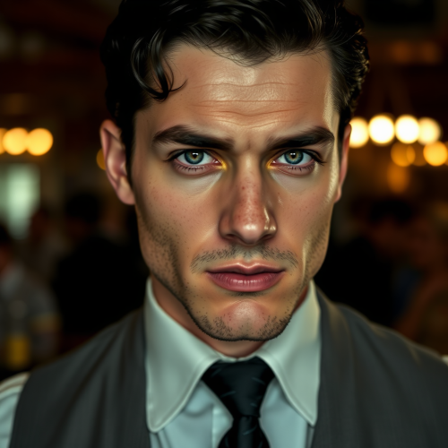 realistic photographer a man, very handsome, dark hair and blue eyes, serious and mischievous look, dressed in black trousers, black t-shirt and black suspenders, men's fingerless leather gloves to motorbiker, in a nightclub
