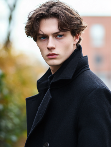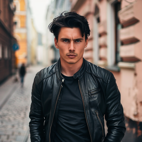 photo of a attractive handsome man with black hair, blue eyes, olive toned skin, wearing black leather jacket and jeans, standing on street corner in late afternoon. soft skin, natural lighting, low contrast --style raw --v 6.0