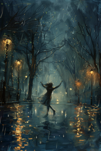 A man in a bright multicolored suit and hat dancing merrily in the center of a carnival procession on a night street, all people dressed in bright clothes with bright spots of paint on their clothes. The scene takes place on a night street brightly lit by lanterns. On the asphalt puddles after the rain in these puddles brightly reflects the whole scene. The carnival atmosphere captures everyone present, the setting is imbued with exciting energy. by tony taka --ar 16:9 --c 10 --s 980 --style 2R2YPCL8uRmuKJahCMpQpkANaECsV2JVNIAQHnTr0Y --v 5.2