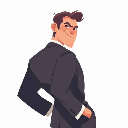 Handsome slim man in business suit standing smiling and looking back and looking back, flat vector illustration, simple style, white background --niji 6