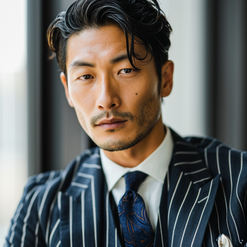 a handsome asian man in a pinstripe suit --style raw --v 6.0