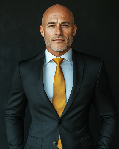 a happy successful bald headed man in a stylish black suit with a gold tie, he is very hansome, penetrating eyes confident stance, full body zoomed out photo portrait, style raw --ar 4:5 --s 250