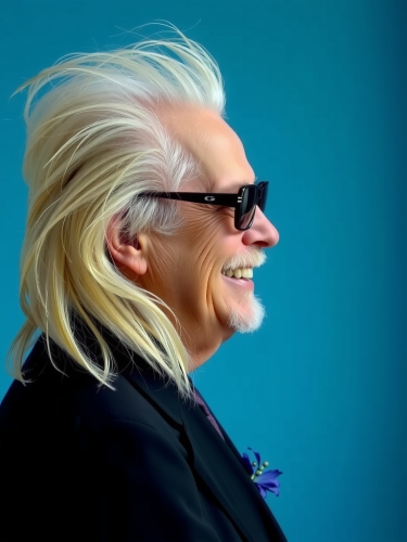 Portrait of a 50-year-old man in profile, a mysterious smile on his face, wearing dark glasses, with a large nose, with the collar of a black coat raised to his chin, a blue flower on his shoulder, shades of blue, white, gray, Annie Leibovitz, Richard Avedon ar 1:1