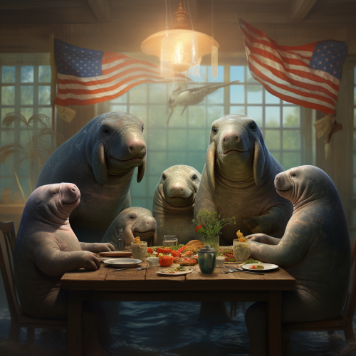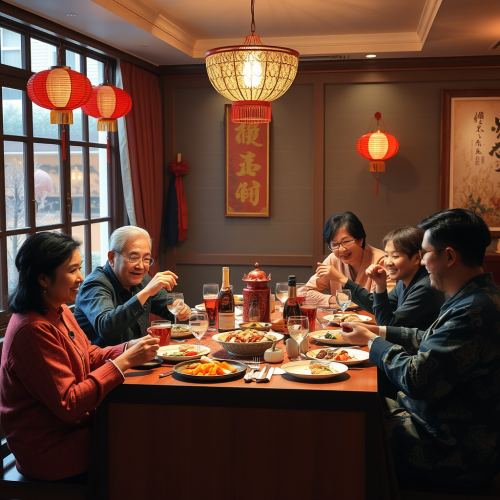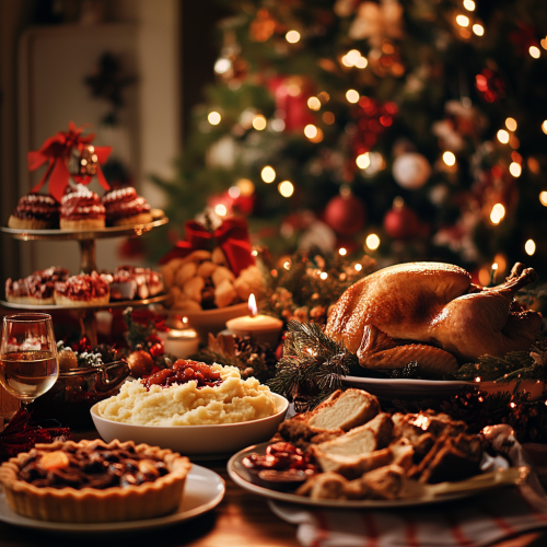 A warm family Christmas celebration, with a group of family members sitting around a beautifully decorated dining table, sharing a festive meal. The focus is on the delicious food--roast turkey, mashed potatoes, gravy, pies, and Christmas-themed desserts--glowing under soft, golden lighting. In the background, a Christmas tree adorned with twinkling lights, ornaments, and presents is slightly blurred to keep the emphasis on the meal. The family is smiling, chatting, and toasting with glasses, capturing the joy and togetherness of the holiday in a cozy, realistic setting.