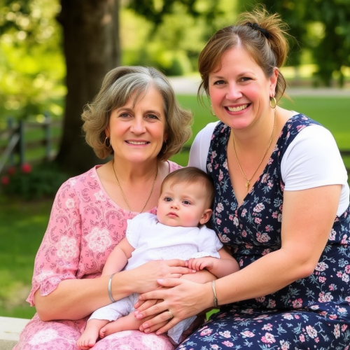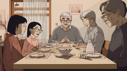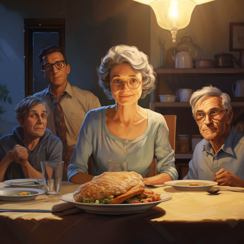 an 82 year old woman, sittting at the dinner table with her family, after she has just cooked dinner for them, in a near future style