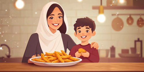 A Ramadan scene with two arab people, an adult woman, and a young boy, enjoying eating chicken strips together during Iftar dinner. The adult woman smiles warmly as she places her hand on the boy's shoulder. joyfully eating. They are standing at a wooden counter with a plate of golden, crispy chicken strips in front of them. The surroundings have Ramadan decoration elements, ultra-realistic. --ar 2:1 --v 6.1