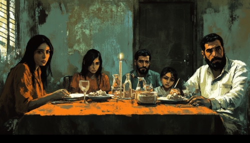 poor middle eastern setting, a man and his grown family sitting at the dinner table , david fincher movie, , dark green and orange color palette, wil lett faces , soft lightinig --ar 7:4 --v 6.1