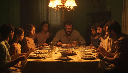 poor middle eastern setting, a man and his grown family sitting at the dinner table , david fincher movie, , dark green and orange color palette, well lit faces , soft lightinig --ar 7:4 --v 6.1