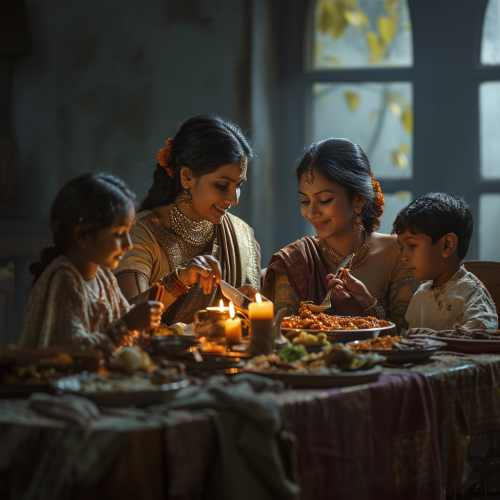 hyperrealistic studio shot of a light-skinned indian mother, son & daughter sat around a dining table eating dinner --v 6.0
