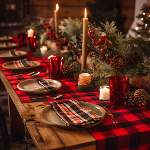 photorealistic christmas dinner table. light and happy colors. day. picture is made from the top. top view pov. wine is on the table. no people
