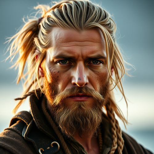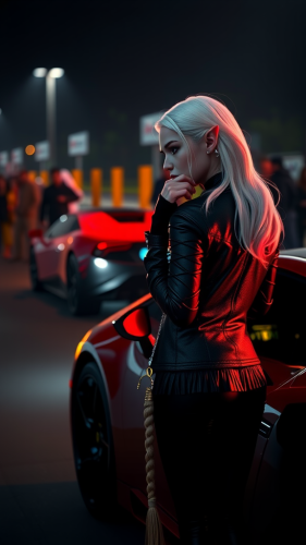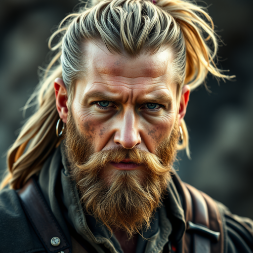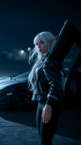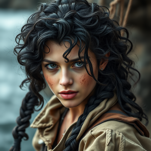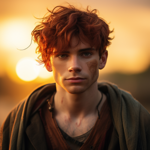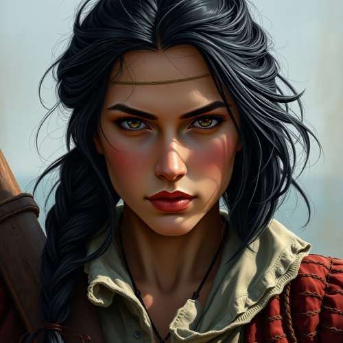 Half elf, girl, rogue class, dnd character, leather armor, tightly wrapped with straps on hips and limbs. Peculiarities: long elf ears, a noticeable scar on the right ear. Light colored skin, reddish-red hair