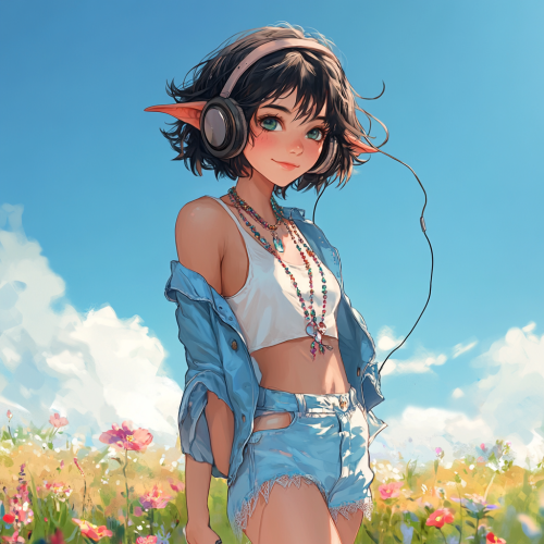 A cute girl with short hair and elf ears, wearing a summer tank with shorts and headphones around her neck. Long necklaces and a button up shirt with rolled up sleeves around her elbows. Leaning back looking over her left shoulder at the camera. Background is a field with flowers and a clean sky with few clouds. Simple design with clean lines. High definition, 8K. No shading. Dream-like. Anime style. Coloring pages.