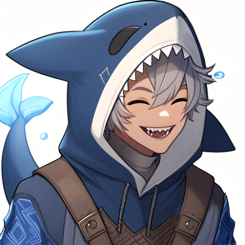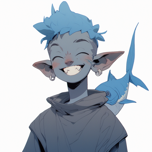 blue skin man with big happy smile, short hair, grey hood, grey pirate clothes, fish fins for ears --niji 4