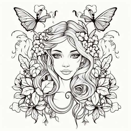 coloring book, simple drawing , outlines , an elf with elf ears, rectangle frame of leaves , symmetrical butterflies and flowers, simple drawing