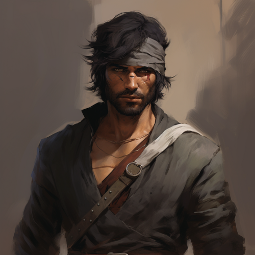 DnD, Male, ranger, fantasy, rugged, tall, muscular, scarred, sooty, eyepatch, wood elf, woodelf, arab, arabian, elf ears