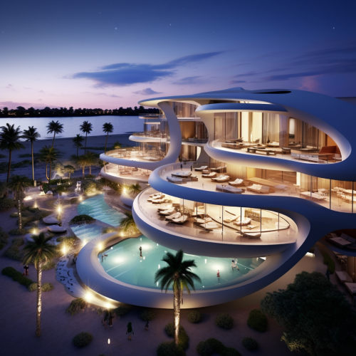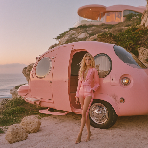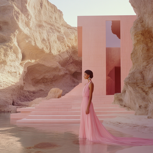 Kaufmann House: Frank Lloyd Wright's waterfall house reimagined in a futuristic version in a lunar setting. full length image, pink tones, beach popup givenchy, jewelry, minimalist style, hyper-realistic, shot by jamie hawkesworth, beach location by David burdeny full length image, beach popup givenchy, fabric light in the wind which gives a dreamy and romantic atmosphere, minimalist style, hyper-realistic --s 250