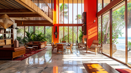 Interior photograph of an exact copy of the Lovell Beach House on a white sand beach in Tulum, Mexico --ar 16:9 --v 6.0
