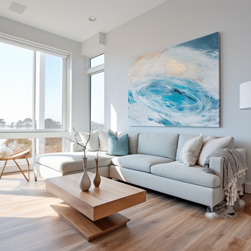 realistic centered photo from inside of a beach house looking out over the sand and shimmering ocean with the california coastline in the distance on a beautiful sunny day with golden sunlight at 24mm, 50 megapixels, DPI 300, --ar 9:20 --s 750 --v 6.0 --style raw