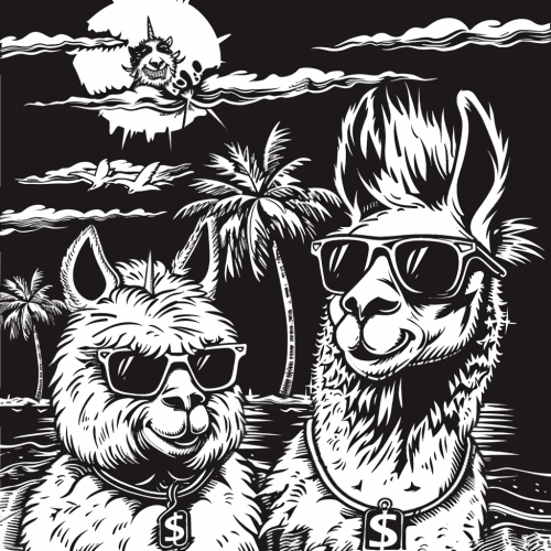 vector image, chill llama on the beach with sunglasses a Mohawk and a dollar sign necklace with his best friend a cat, monochromatic