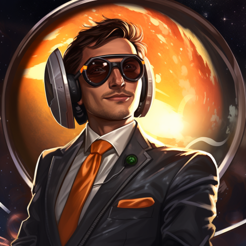 a man with a suit and tie, brown hair, ski goggles, he's a podcaster, and his name is captain cosmos. he's in a spaceship