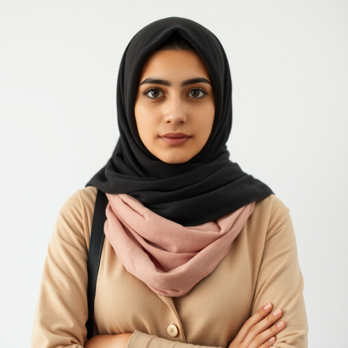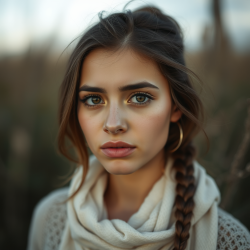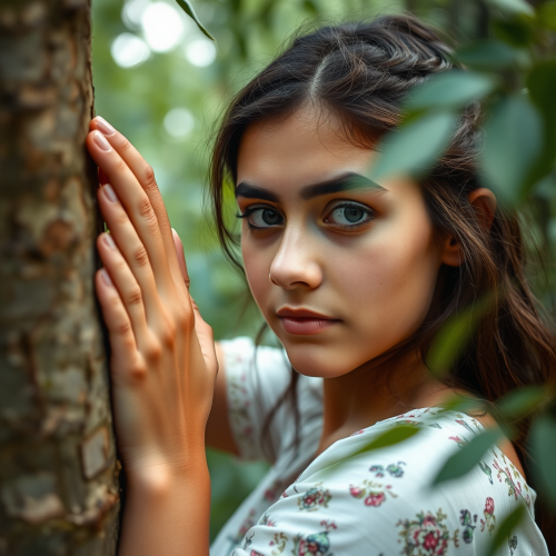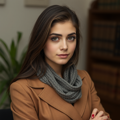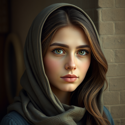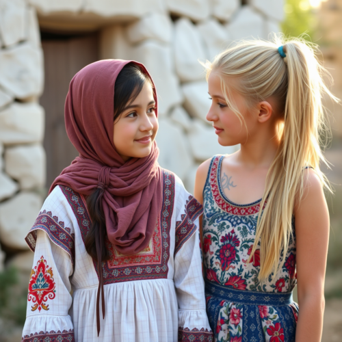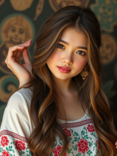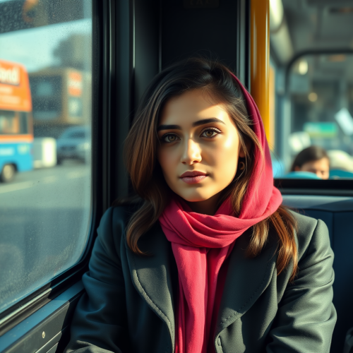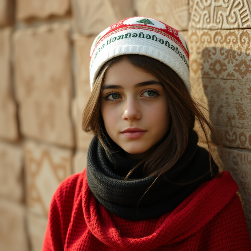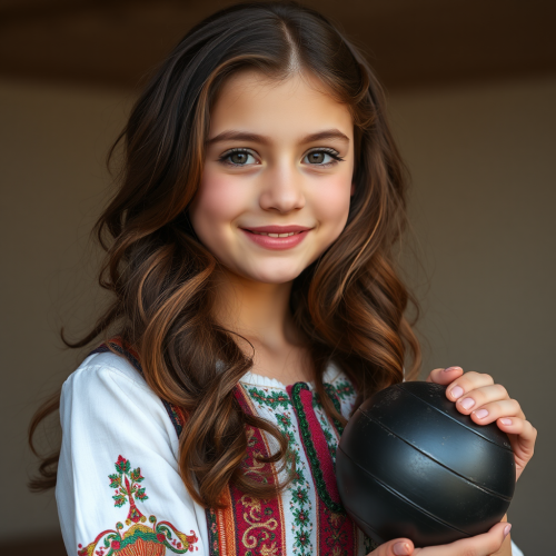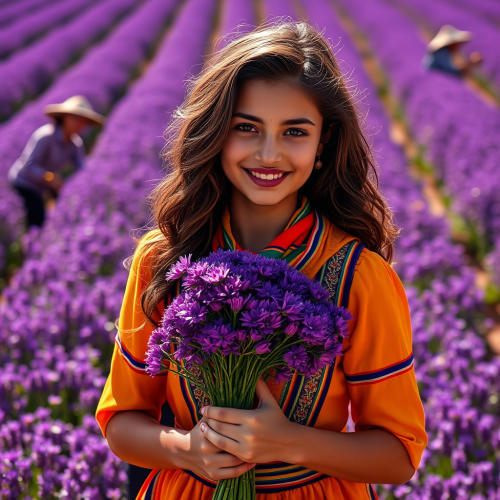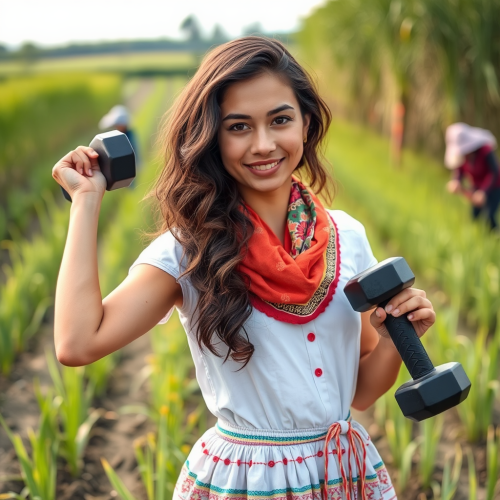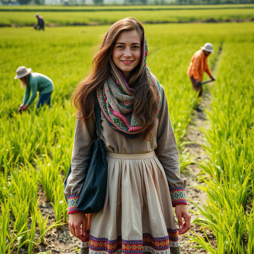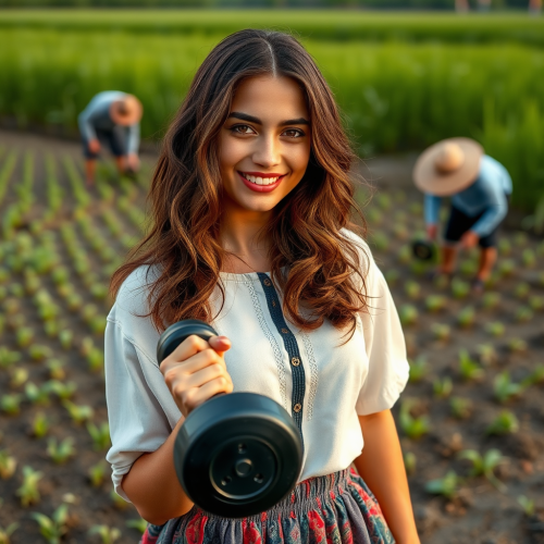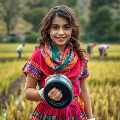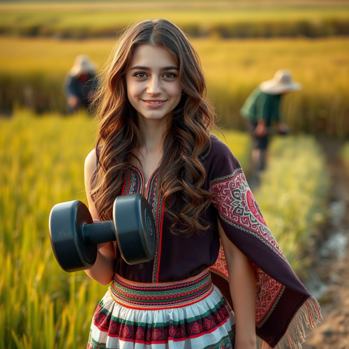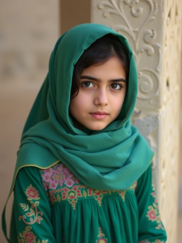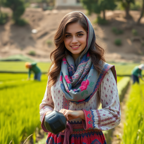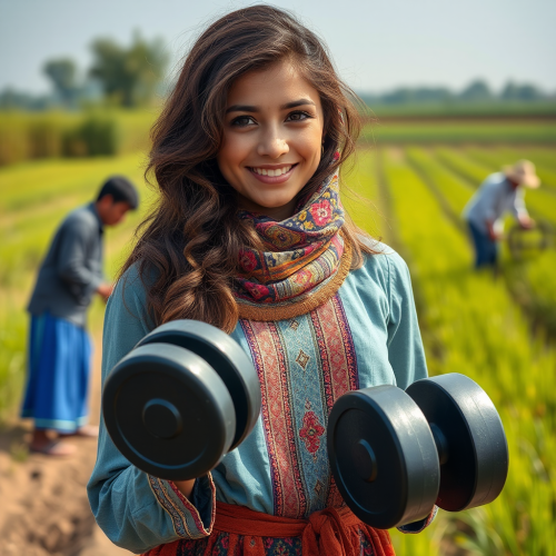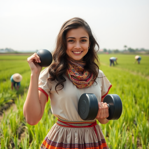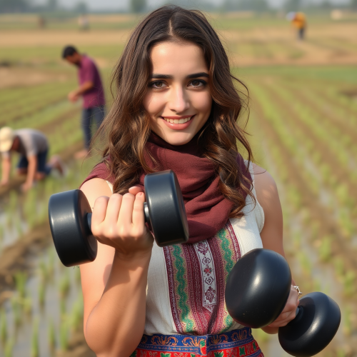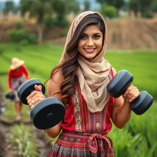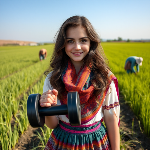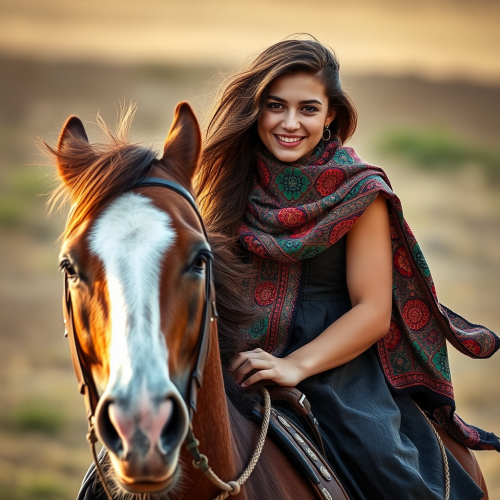 An Iranian and Muslim girl who has wavy brown hair and a kind face. The girl has dark honey eyes and smiles. She is riding a horse, but at the same time she has a very fit body and her big muscles are visible from the back of the dress. The girl wears a long local Iranian dress with a skirt and a colorful local scarf and covers her hair. She is riding a brown horse with a white forehead. The horse's mane is flying in the air.