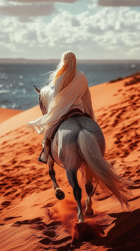 galloping horse, pov from behind, dark gray dapple horse with white mane and tail, blonde female riding with ancient white cloak and tunic with pants, over sand dunes in a red desert next to a blue ocean, , ornate saddle, sunlight, high contrast, 8k detail, shot on a Sony Alpha a7 III camera --ar 9:16