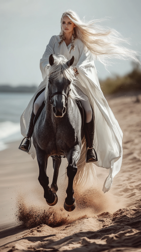 horse running, pov from behind, dark gray dapple horse with white mane and tail, blonde female with long hair riding with ancient white cloak and tunic with pants, over desert sand beach with blue ocean, sunlight, high contrast, 8k detail, shot on a Sony Alpha a7 III camera --ar 9:16