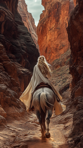 horse sprinting, dark gray dapple horse with white mane and tail, blonde female with long hair riding with ancient white cloak and tunic with pants, cloak billowing behind her, red orange rock skinny canyon ravine, sunlight, high contrast, pov from behind, 8k detail, shot on a Sony Alpha a7 III camera --ar 9:16