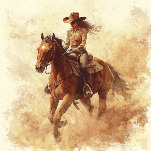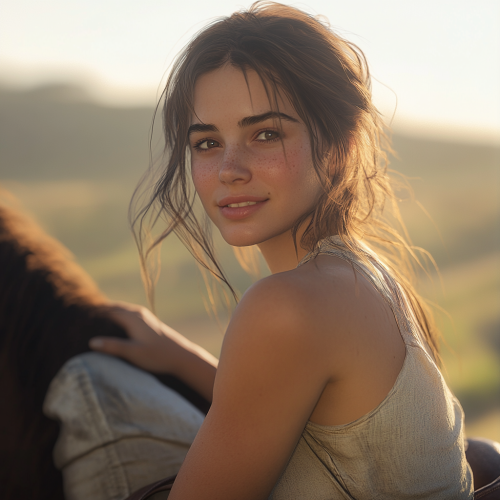 A high-resolution, hyper-realistic close-up image of a woman in her late 20s sitting on a horse, capturing her joyful expression as she looks directly at the camera. She is wearing light, breathable clothing suitable for warm weather, such as a sleeveless top. Her hair flows freely in the gentle breeze, catching the sunlight. The background is softly blurred, suggesting a warm, sun-drenched landscape with hints of greenery and blue sky. The focus is on her face, radiating happiness and relaxation, embodying the essence of a perfect summer day spent horseback riding. The warm sunlight casts a soft glow on her features, enhancing the inviting atmosphere of the scene. –v 5 –ar 16:9 –style hyper-realistic –quality 2