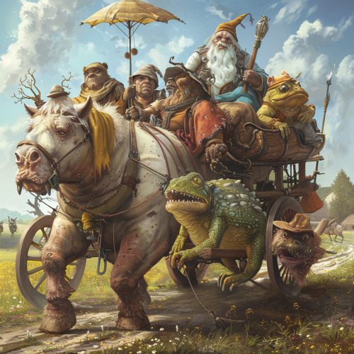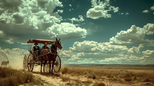 old west, horse drawn buggy with 4 wheels, 1 man sitting in the front of the buggy and 2 men in the back, cinematic style, wide lens --ar 16:9 --v 6.0 --s 250