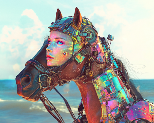 a beautiful robotic woman daydreaming with open eyes, she is riding her beautiful brown horse by the sea , she has a light makeup, emotional art, bright colors, negative colors, shapes are fluid and undefined, high definition digital art, negative color, a mix of pastel colors and neon, a poetic and creative perspective, inspired by Man Ray's visionary photography, large-screen camera, photo art that is also inspired by digital art, cold color scale with hints of flickering neon, --ar 5:4