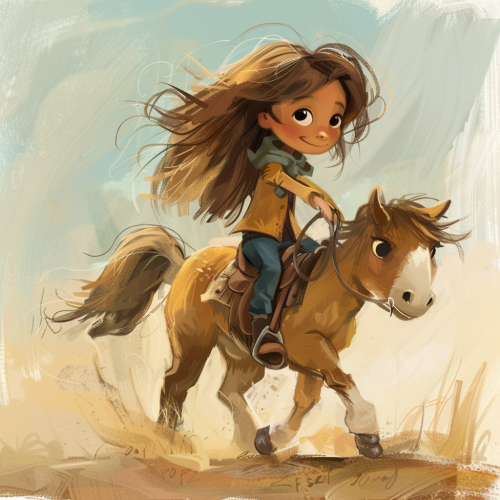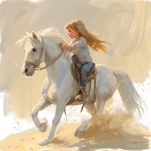 You are an illustrator and need to draw a picture of a little girl riding a white horse. The picture should show a little girl riding on a white horse, and please carefully depict the posture of the little girl riding the horse and the shape of the white horse, as well as showing the interaction between the two. At the same time, please ensure that the overall picture is warm and cute, in line with the atmosphere of a fairy tale.