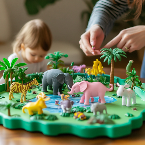 a parent and child playing with animal figurines on a table that has a toy jungle scene. Make the toy animals and the pretend jungle on the table pink.