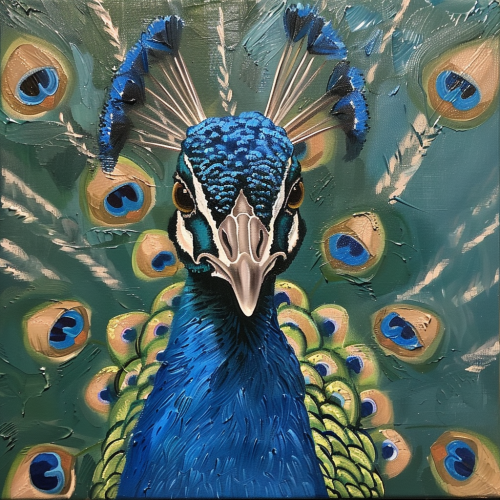 a painting in acrylic of a blue peacock facing forward and looking straight at the camera