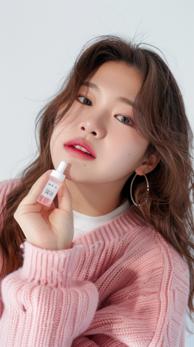 A beautiful healthy korean woman like kpop idol WONYOUNG wearing pink cardigan and jeans pants, Posing for the camera to introduce the product of a lotion, ultra cute face, gentle hair, Korean makeup, light white background, studio style, delicate light and dark, white powder, wet core, Korean wave, Studio lighting, photography, Scenes from a live Instagram feed, 8K, --style raw --stylize 50 --ar 9:19 --v 6.0