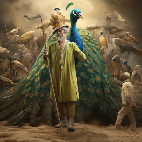 a man, a peacock, the man is a miner, the peacock is light blue, the man is larger than the peacock, the man is hunting the peacock, the man is using a pickaxe to hunt, the man is wearing green and gold attire, photorealistic, 8k