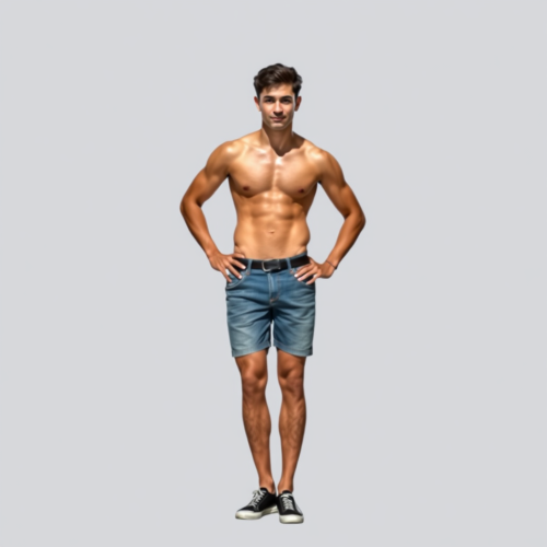 a human bodybuilder Bert (taller, lean, sallow, dolichocephalic, tuft of black hair standing straight up) and a human bodybuilder Ernie (shorter, broader, merry, brachiocephalic, ruddy/tanned, with a sideways tuft of black hair, ready for some fun) on the beach