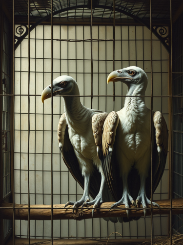 a big strong lion trying to fit in an extremely small cage. with the pawns being outside the cage because it is to small